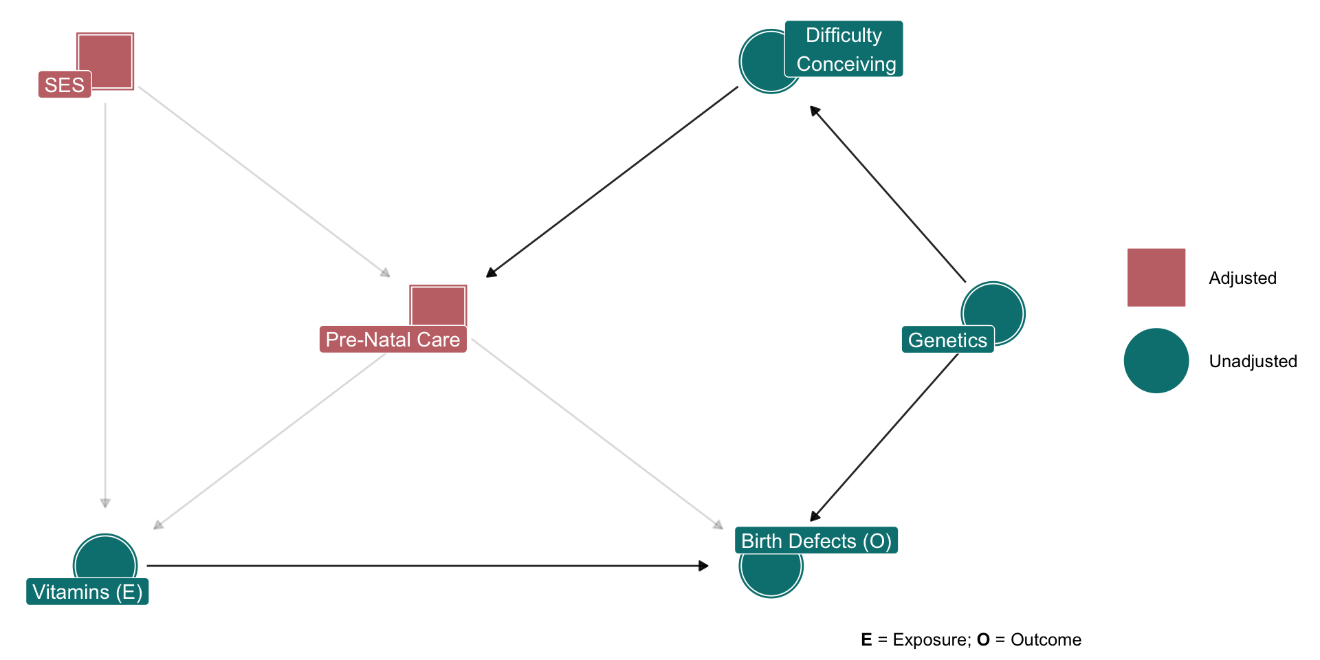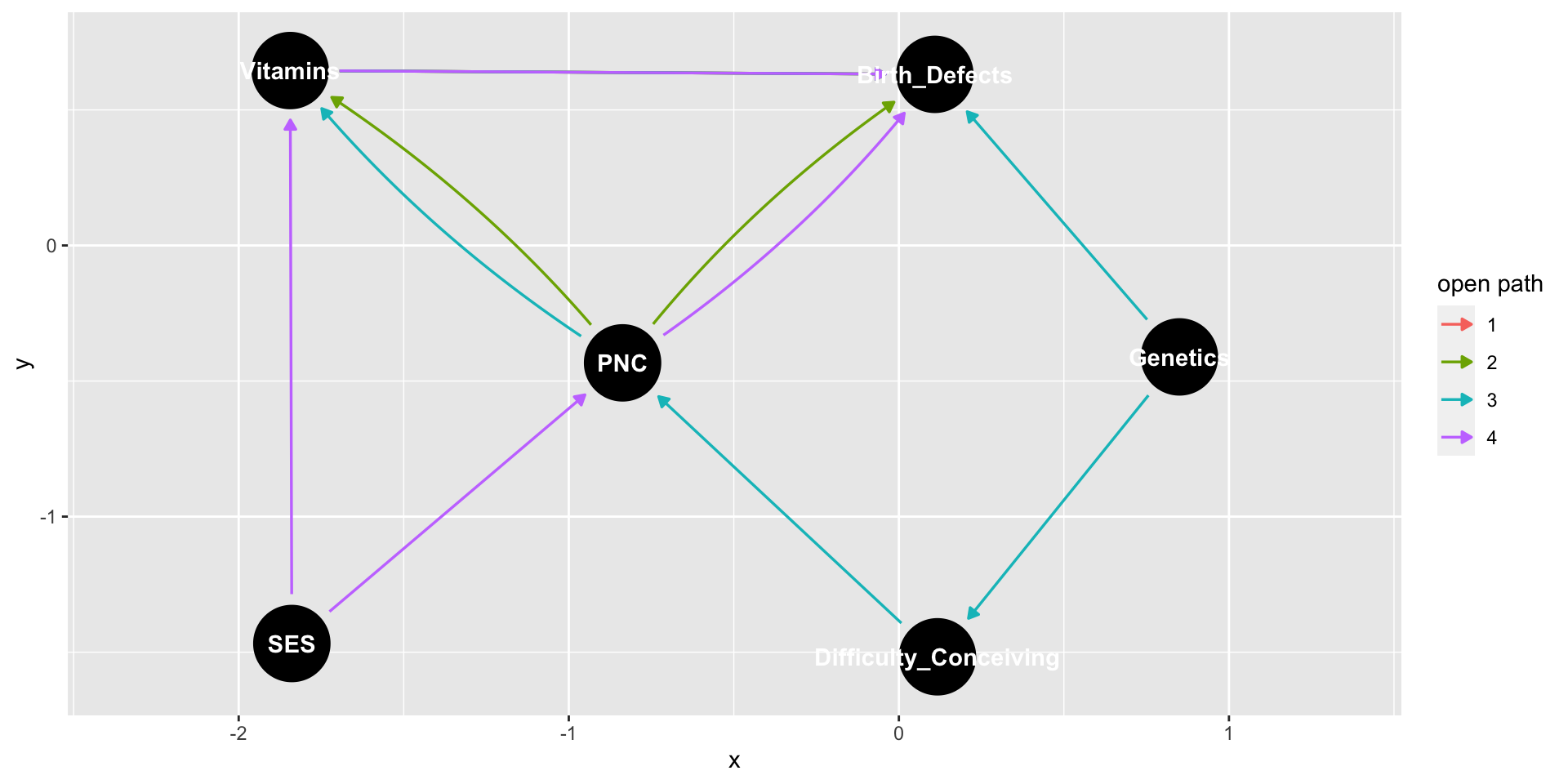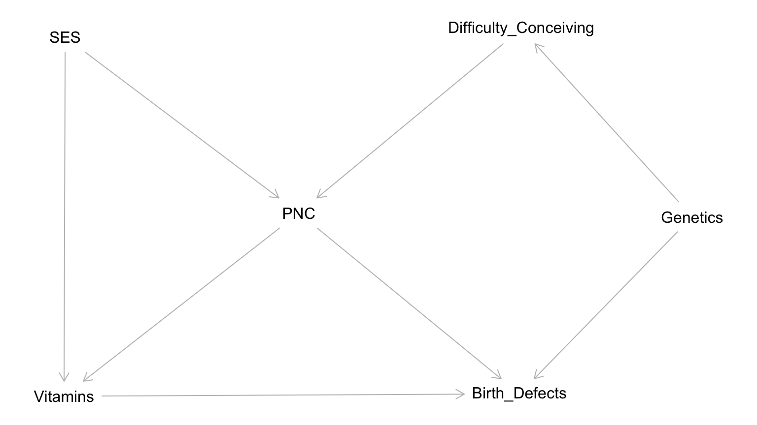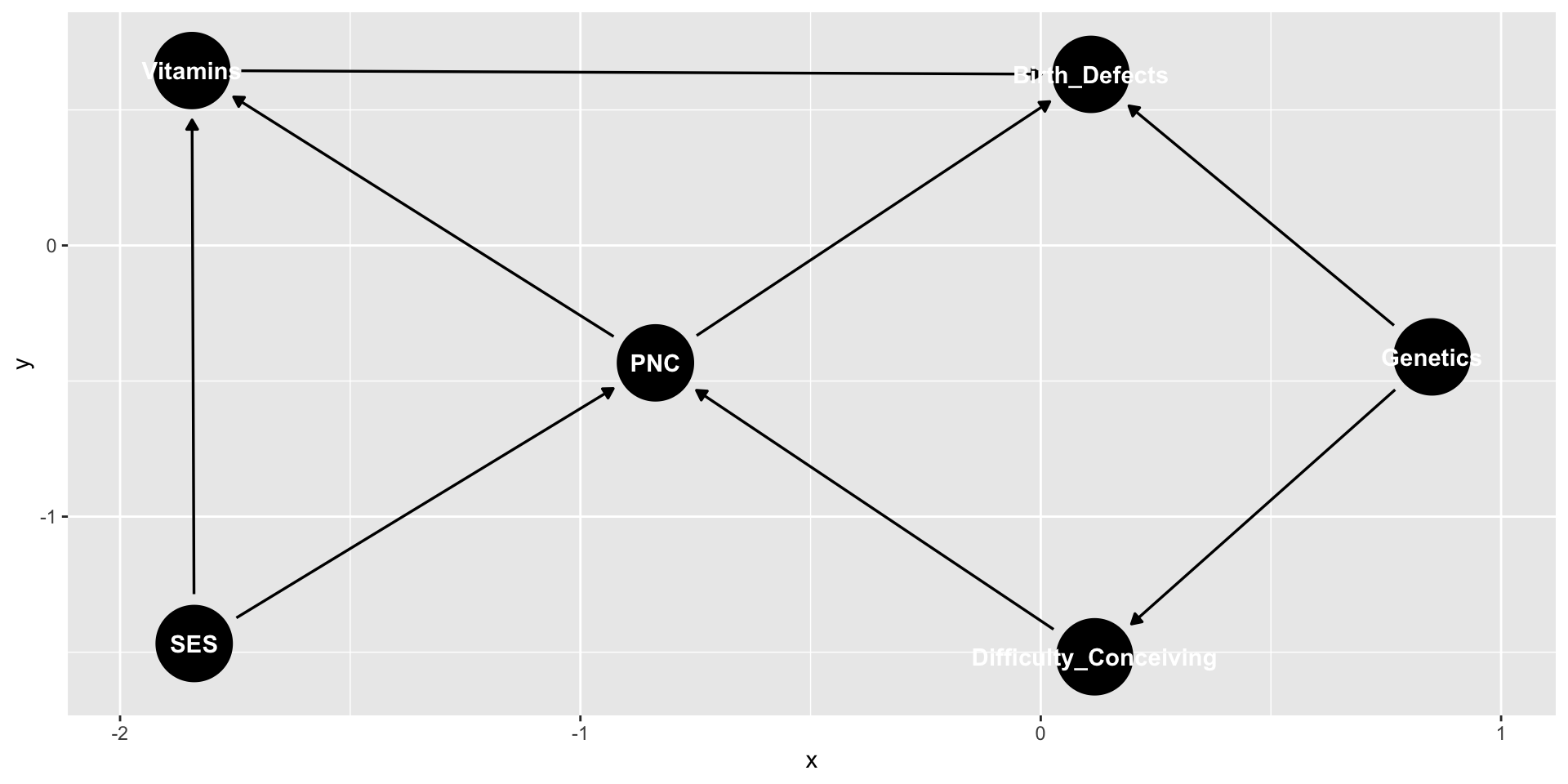 dag_cand3 <-dagify(#Here, we see conventional R syntax (e.g., outcome ~ predictors) birth_defects ~ vitamins + pnc + genetics, vitamins ~ ses + pnc, pnc ~ ses + diff_conceiving, diff_conceiving ~ genetics,#These labels will be useful for plotting purposes down the line!labels =c(#\n signals a line breakbirth_defects ="Birth Defects\n (Outcome)",vitamins ="Vitamins\n (Exposure)",pnc ="Pre-Natal Care",diff_conceiving ="Difficulty\n Conceiving",ses ="SES",genetics ="Genetics"),exposure ="vitamins",outcome ="birth_defects")