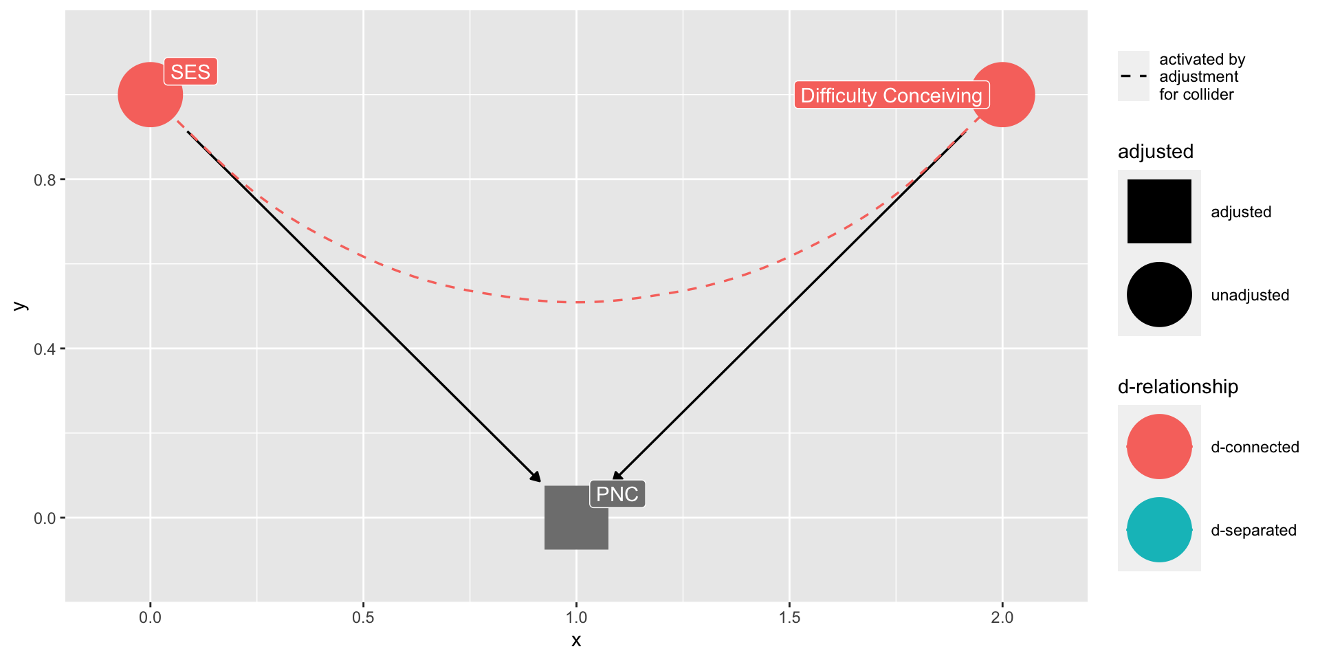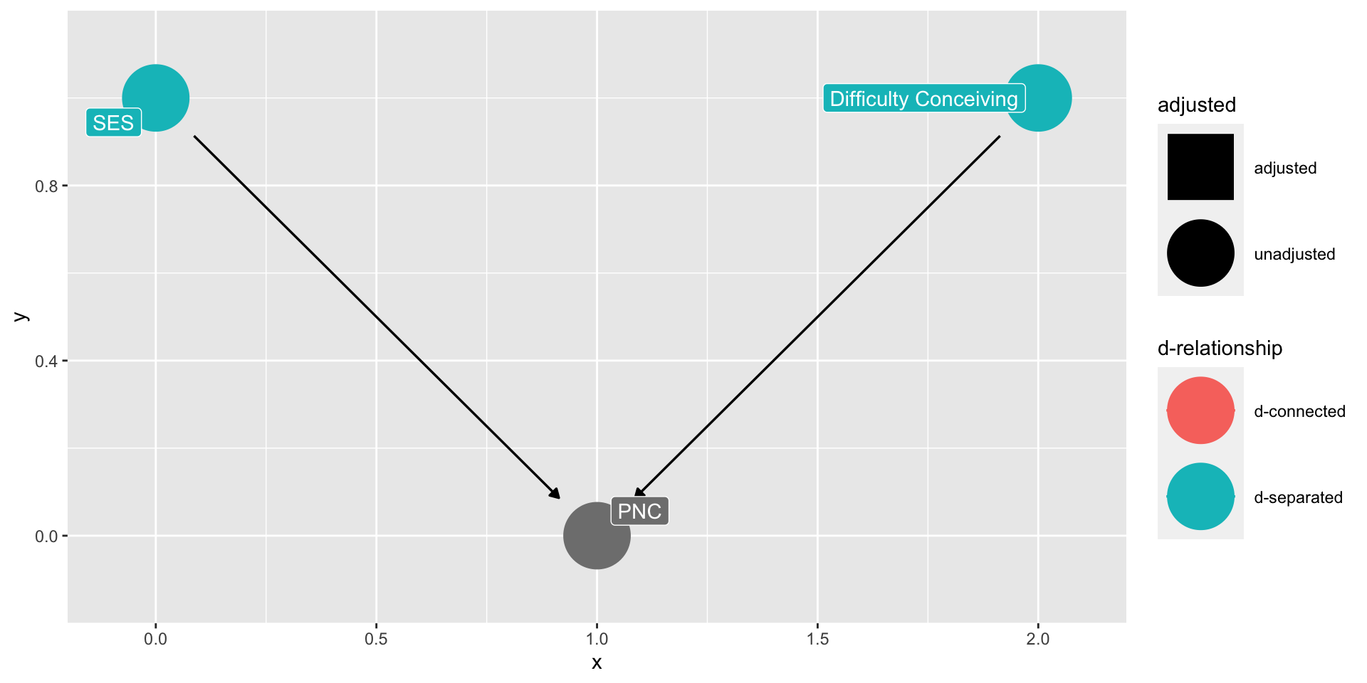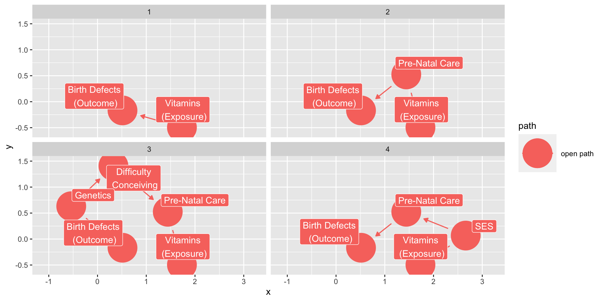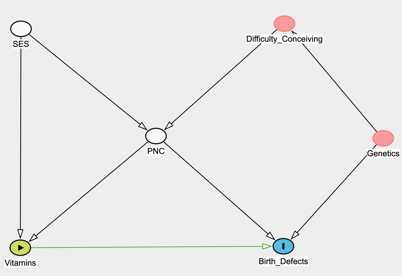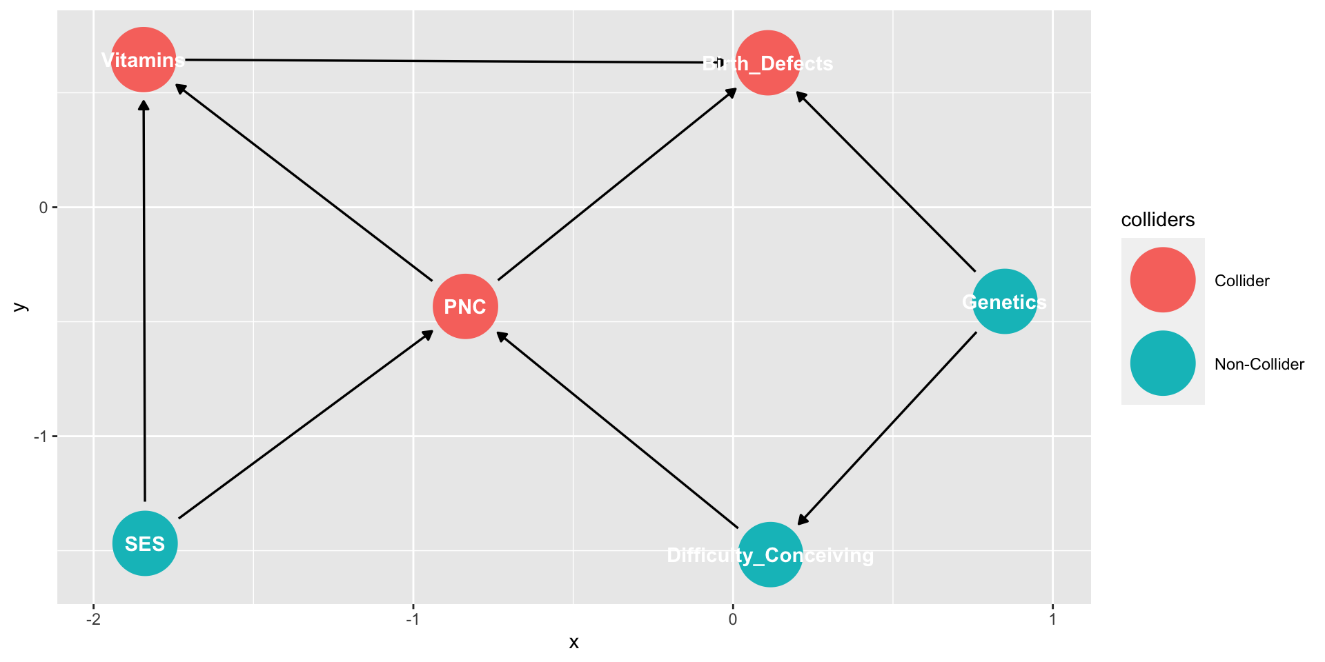 dag_cand3 <-dagify(#Here, we see conventional R syntax (e.g., outcome ~ predictors) birth_defects ~ vitamins + pnc + genetics, vitamins ~ ses + pnc, pnc ~ ses + diff_conceiving, diff_conceiving ~ genetics,#These labels will be useful for plotting purposes down the line!labels =c(#\n signals a line breakbirth_defects ="Birth Defects\n (Outcome)",vitamins ="Vitamins\n (Exposure)",pnc ="Pre-Natal Care",diff_conceiving ="Difficulty\n Conceiving",ses ="SES",genetics ="Genetics"),exposure ="vitamins",outcome ="birth_defects")