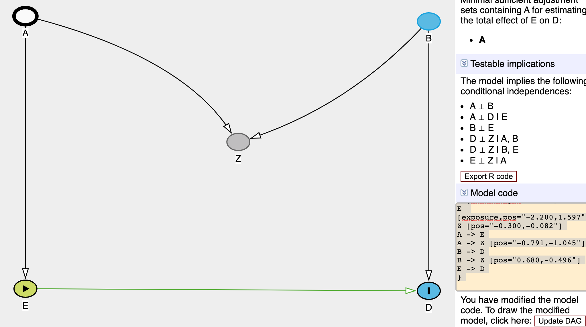 dag_cand3 <-dagify(#Here, we see conventional R syntax (e.g., outcome ~ predictors) birth_defects ~ vitamins + pnc + genetics, vitamins ~ ses + pnc, pnc ~ ses + diff_conceiving, diff_conceiving ~ genetics, exposure ="vitamins",outcome ="birth_defects")
